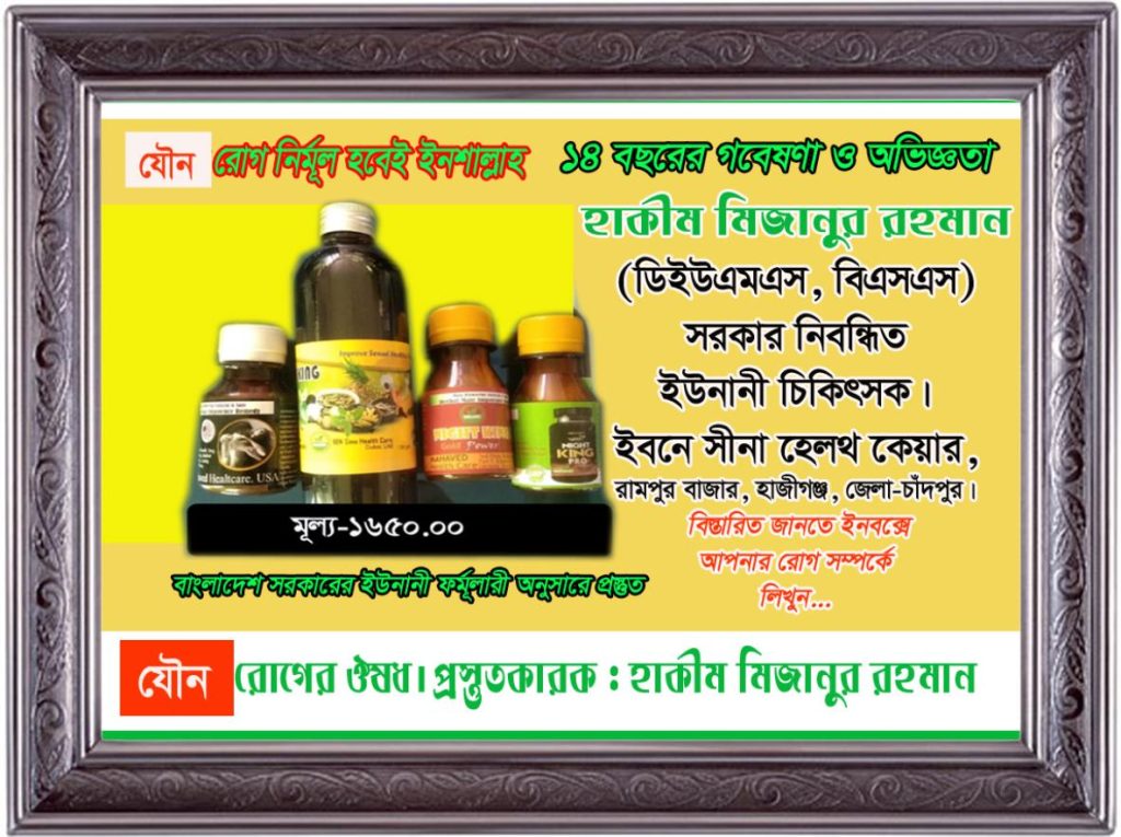 হাকীম ডা. মিজানুর রহমান, ডিইউএমএস, বিএসএস সরকারি রেজি. নং-৩৫৪৬/এ ইবনে সিনা হেলথ কেয়ার, চাঁদপুর। ইমো-হোয়াটস অ্যাপ ও মোবাইল নাম্বার : 01762240650