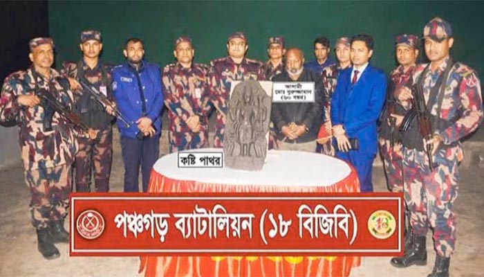 পঞ্চগড়ে ২৫ লাখ টাকা মূল্যের একটি কষ্টিপাথর উদ্ধার করেছে টাস্কফোর্স। বর্ডার গার্ড বাংলাদেশ সদস্যরা ম্যাজিস্ট্রেট ও থানা পুলিশকে সঙ্গে নিয়ে টাস্কফোর্স অভিযান পরিচালনা করে। এসময় নুরুজ্জামান হোসেন (৬০) নামে এক ব্যক্তিকে আটক করা হয়। আটক নুরুজ্জামান পঞ্চগড় সদরের অমরখানা ইউনিয়নের বিদ্যাপিঠা গ্রামের বাসিন্দা।