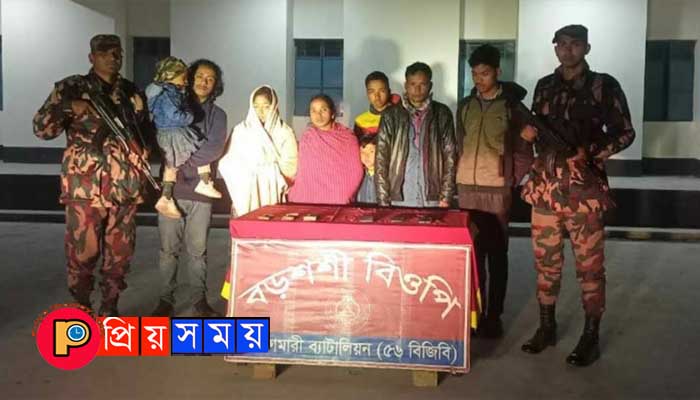 আটকরা হলেন- দিনাজপুরের পার্বতীপুর উপজেলার ছোট চন্ডীপুর গ্রামের জিতেন্দ্র নাথ রায়ের ছেলে বিশ^জিত রায় (২৭), বিশ্বজিত রায়ের স্ত্রী খুশি রায় (২৩) ও তার ছেলে প্রানাভি রায় (৩), একই জেলার কাহারোল উপজেলার তেলিয়ান গ্রামের শ্রী ভবেস রায়ের ছেলে শ্রী রতন রায় (৩০), রতন রায়ের স্ত্রী চন্দনা রাণী রায় (২৮), তার ছেলে শ্রী সমর রায় (১০) ও মেয়ে চুমকা রাণী রায়(৮)।