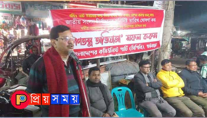 সোমবার (২৬ জানুয়ারি) সন্ধ্যায় স্থানীয় চারমাথায় কমিউনিস্ট পার্টি, দারিয়াপুর অঞ্চল কমিটির উদ্যোগে অঞ্চল সভাপতি জাহাঙ্গীর আলম মাস্টারের সভাপতিত্বে অনুষ্ঠিত হাটসভায় বক্তব্য রাখেন কমিউনিস্ট পার্টির কেন্দ্রীয় কমিটির সহকারি সাধারণ সম্পাদক কমরেড মিহির ঘোষ, জেলা সিপিবি’র সাধারণ সম্পাদক মোস্তাফিজুর রহমান মুকুল, গাইবান্ধা সদর উপজেলা সিপিবি’র সভাপতি ছাদেকুল ইসলাম মাস্টার, ক্ষেতমজুর সমিতির জেলা সাধারণ সম্পাদক ময়নুল কবীর মন্ডল, ক্ষেতমজুর নেতা এমদাদুল হক মিলন প্রমুখ।