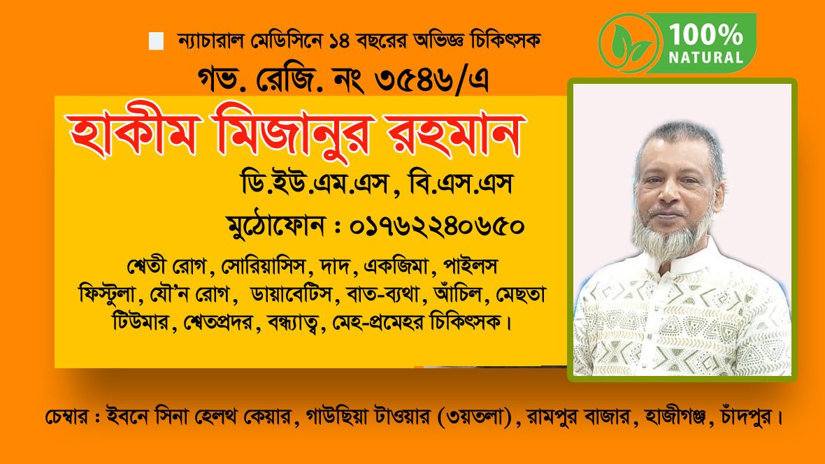 লেখক পরিচিতি : বি ইউ এম এস, এম পি এইচ (নিউট্রেশন) (এইচ ইউ বি), ডি ইউ এম এস- (ঢাকা) প্রভাষক, চাঁদপুর ইউনানী তিব্বীয়া কলেজ, চেম্বারঃ মডার্ণ শেফা ক্লিনিক, চেরাগআলী মার্কেট ২য় তলা , বাবুরহাট, চাঁদপুর।