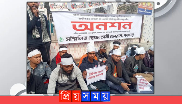 পঞ্চগড় জেলা সদরসহ পাঁচ উপজেলার সরকারি স্বাস্থ্য কমপ্লেক্সগুলোতে ১৬৯ চিকিৎসকের পদের বিপরীতে মাত্র ৪৫ জন চিকিৎসক রয়েছেন। এই সংকটে চিকিৎসাসেবা থেকে বঞ্চিত হয়ে দুর্ভোগের শিকার হচ্ছেন স্থানীয় বাসিন্দারা। সমস্যা সমাধানে ৯ দফা দাবিতে অনশন কর্মসূচি পালন করেছে জেলার তরুণ স্বেচ্ছাসেবী সংগঠন।