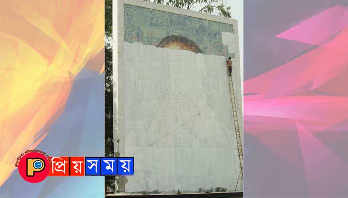 রোববার সকাল থেকে সাদা রঙের প্রলেপে ম্যুরাল থেকে বঙ্গবন্ধুর ছবি মুছে দেওয়ার কাজ শুরু হয়। বেলা সাড়ে ১১টার দিকে সেখানে দেখা যায়, নগরের সিঅ্যান্ডবি মোড়ে একজন অনেক বড় মই দিয়ে ওপরে উঠে ব্রাশ দিয়ে রং করছেন। নিচ থেকে তাঁর দিকে তাকালে বোঝা যাচ্ছিল, একজন মানুষের তুলনায় ম্যুরালটি কত বড়। এ সময় নিচে আরও কয়েকজন সহযোগী তাঁকে সহযোগিতা করছেন। এ সময় রাস্তা দিয়ে যাঁরা যাচ্ছিলেন, তাঁরাই তাকিয়ে দেখছেন।