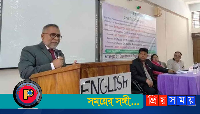 এ সময় পিএইচডি’র বিষয়বস্তু নিয়ে আলোচনা করেন ইংরেজি বিভাগের শিক্ষকরা। প্রধান অতিথি অধ্যাপক ড. নকীব মোহাম্মদ নসরুল্লাহ পিএইচডি’র বিষয়বস্তুর উপর আলোকপাত করেন এবং গবেষণাকে আরও সৃজনশীল ও উৎপাদনশীল করার লক্ষ্যে দিক নির্দেশনা দেন।