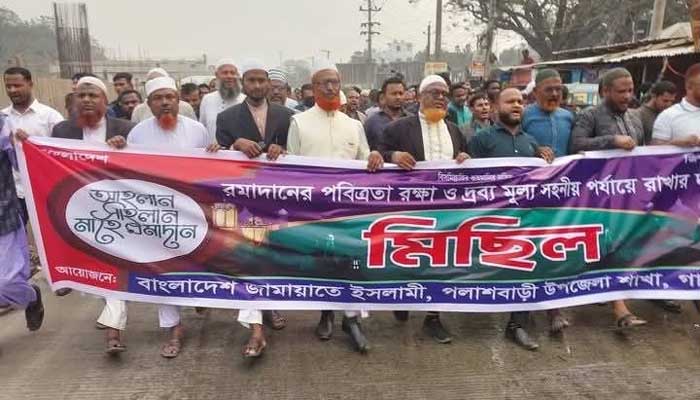 পবিত্র মাহে রমজানের পবিত্রতা রক্ষার দাবি ও দ্রব্যমূল্যের ক্রমাগত উর্ধ্বগতির প্রতিবাদে বাংলাদেশ জামায়াতে ইসলামী গাইবান্ধার পলাশবাড়ী উপজেলা শাখার উদ্যোগে মিছিল অনুষ্ঠিত হয়েছে।