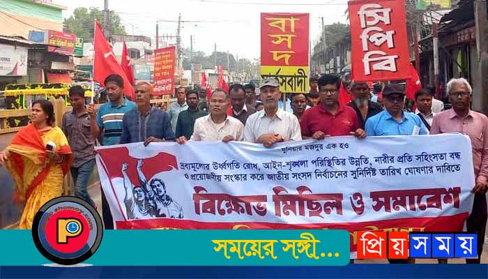 বক্তারা বলেন, বৈষম্য বিরোধী আন্দোলনের মধ্যদিয়ে বিগত ফ্যাসিস্ট সরকারের পতন হয়েছে। দ্রব্যমূল্যের উর্ধ্বগতি লাগামহীন, সারাদেশে নারী-শিশু ধর্ষণ, নিপীড়ন বেড়েছে উদ্বেগজনক হারে, ঢাকাসহ সারা দেশে ডাকাতি, ছিনতাই, খুন, মব সন্ত্রাস, দখলদারিত্ব অব্যাহতভাবে বেড়ে যাচ্ছে। অন্তর্বর্তী সরকার পুরোপুরি ব্যর্থতার পরিচয় দিচ্ছে। এই সময়ে সবচেয়ে বেশি বৈষম্যের শিকার হচ্ছে নারী আর গরীর মানুষ। তারা ব্যর্থ স্বরাষ্ট্র উপদেষ্টার অবিলম্বে পদত্যাগ দাবি করেন এবং এর বিরুদ্ধে রুখে দাঁড়াতে জনগণের প্রতি আহবান জানান। বক্তারা অবিলম্বে জাতীয় সংসদ নির্বাচনের সুনির্দিষ্ট তারিখ ঘোষণার দাবি জানান। পরে বিক্ষোভ মিছিলটি শহরের প্রধান সড়ক প্রদক্ষিণ করে ১নং রেল গেইটে এসে শেষ হয়।