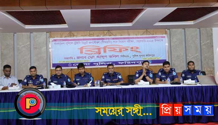 আজ শনিবার জেলা পুলিশ, ফরিদপুর এর আয়োজনে পুলিশ লাইনস্ শহীদ ছালাম সভা কক্ষে বাংলাদেশ পুলিশে ট্রেইনি রিক্রুট কনস্টেবল (টিআরসি) পদে নিয়োগ পরীক্ষা, ফেব্রুয়ারি- ২০২৫ সংক্রান্তে ব্রিফিং অনুষ্ঠিত হয়।
