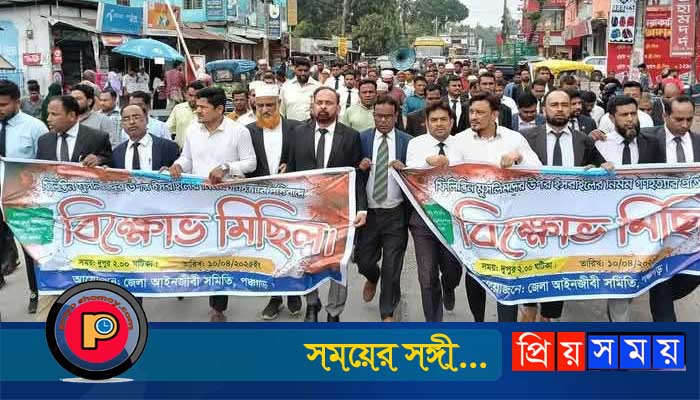 ফিলিস্তিনের গাজা উপত্যকায় ইসরায়েলের চলমান হামলার বিরুদ্ধে পঞ্চগড়ে আইনজীবীদের ব্যানারে বিক্ষোভ মিছিল অনুষ্ঠিত হয়েছে । বৃহস্পতিবার ( ১০ এপ্রিল ) দুপুরে পঞ্চগড় আদালত চত্বর থেকে জেলা আইনজীবী সমিতির ব্যানারে একটি বিক্ষোভ মিছিল বের হয়ে জেলা শহরের চৌড়ঙ্গী মোড়ের শের-ই বাংলা পার্কের সামনে এসে সংক্ষিপ্ত সমাবেশে অংশ নেয়।