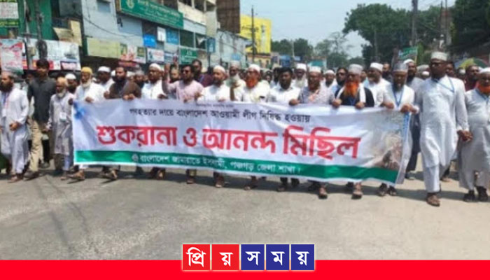 অন্তর্বর্তী সরকারের উপদেষ্টা পরিষদের বৈঠকে বিচার না হওয়া পর্যন্ত আওয়ামী লীগের যাবতীয় কার্যক্রম নিষিদ্ধ করার সিদ্ধান্তে পঞ্চগড়ে শোকরানা ও আনন্দ মিছিল করেছে জামায়াতে ইসলামী। রবিবার দুপুরে জেলা জামায়াতে ইসলামীর আয়োজনে শহরের মিঠাপুকুর এলাকার পঞ্চগড় ডায়াবেটিকস সমিতির সামনে থেকে একটি শোকরানা ও আনন্দ মিছিল বের হয়। পরে মিছিলটি শহরের প্রধান প্রধান সড়ক প্রদক্ষিণ করে চৌরঙ্গী মোড় এলাকায় গিয়ে শেষ হয়।