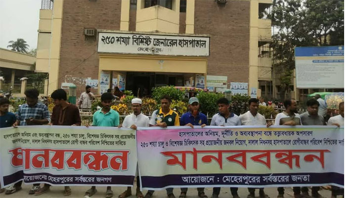 মেহেরপুর জেনারেল হাসপাতালে দীর্ঘদিনের অনিয়ম, দুর্নীতি ও অব্যবস্থাপনার প্রতিবাদ ও তত্ত্বাবধায়কের অপসারণের দাবীতে মানববন্ধন করেছে স্থানীয়রা।
