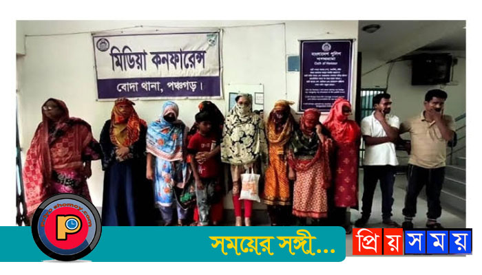 শনিবার (১৭ মে) বিকেলে বিষয়টি নিশ্চিত করেছেন নীলফামারী ৫৬ বিজিবি ব্যাটালিয়নের ভারপ্রাপ্ত অধিনায়ক রিয়াদ মোর্শেদ। আটককৃতরা হলেন, সাতক্ষীরার কালিগঞ্জ উপজেলার বাগবাটি গ্রামের তাসলিমা খাতুন (৪০), কলারোয়া উপজেলার চিতলা গ্রামের মর্জিনা (৪০), নড়াইলের কালিয়া উপজেলার শুক্র গ্রামের নিরুফা বেগম (৪০), যশোরের শার্শা উপজেলার রাজাপুর গ্রামের সাজিদা খাতুন (৪০), ফরিদপুরের সদরপুর উপজেলার আটরশি গ্রামের জাহিদুল ইসলাম (৪০), একই গ্রামের ফাইজান শেখ (১০), নোয়াখালীর শ্যামবাগ উপজেলার ডোমনাকান্তি গ্রামের ওমর ফারুক (৩৭), নারায়নগঞ্জের বন্দর উপজেলার মদনপুর গ্রামের মীম আক্তার (২২), সোনারগাঁও উপজেলার চৌরাপাড়া গ্রামের শাহনাজ (৩৪), নরসিংদীর মাদবদী উপজেলার বালাপুরেরচর গ্রামের তানিয়া (৩৫) ও খুলনার তেরখাদা উপজেলার বাউনডাংগা গ্রামের আলেয়া (৭০)।
