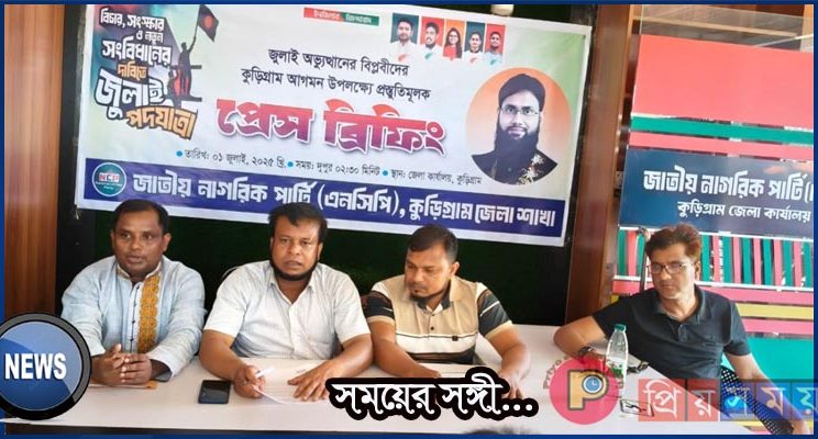 জাতীয় নাগরিক পার্টির (এনসিপি) কেন্দ্রীয় কর্মসূচির অংশ হিসেবে কুড়িগ্রাম সফর উপলক্ষে আজ মঙ্গলবার (১ জুলাই) জেলা কার্যালয়ে এক প্রস্তুতিমূলক প্রেস ব্রিফিং অনুষ্ঠিত হয়েছে। প্রেস ব্রিফিংয়ে জুলাই আন্দোলনের শহীদ বীর যোদ্ধা আবু সাঈদ, মুগ্ধসহ সকল শহীদের আত্মত্যাগের প্রতি বিনম্র শ্রদ্ধা জানানো হয়। পাশাপাশি আহত যোদ্ধাদের প্রতি গভীর সম্মান প্রকাশ করে তাদের সুস্থতা কামনা করা হয়।