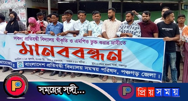 বাংলাদেশের সকল প্রতিবন্ধী বিদ্যালয়ের স্বীকৃতি ও এমপিও ভুক্তির দাবিতে পঞ্চগড়ে মানববন্ধন কর্মসূচি পালিত হয়েছে। মঙ্গলবার (১৫ জুলাই) সকালে পঞ্চগড় শেরে বাংলা পার্ক চৌরঙ্গী মোড়ে ঘণ্টা ব্যাপী এ মানববন্ধন কর্মসূচি পালিত হয়।