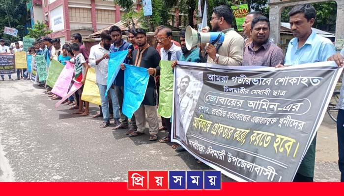 এনিয়ে রবিবার (২০জুলাই) সকালে কুড়িগ্রামের চিলমারী উপজেলা পরিষদের প্রধান ফটকের সামনে নারী-পুরুষের উপস্থিতিতে ঘন্টাব্যাপী মানববন্ধনে রাস্তায় দাঁড়িয়েছেন নিহত জোবায়ের আমিনের বাবা আব্দুল জলিল।