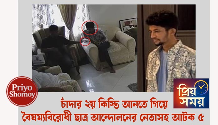 রাজধানীর গুলশানে সমন্বয়ক পরিচয়ে সংরক্ষিত মহিলা আসনের সাবেক এক সংসদ সদস্যের বাসায় চাঁদাবাজী করতে গিয়ে পাঁচজন আটক হয়েছে। জানা গেছে,গুলশানের ৮৩ নম্বর রোডের ওই বাড়িতে বৈষম্যবিরোধী ছাত্র আন্দোলনের বেসরকারি বিশ্ববিদ্যালয় শাখার যুগ্ম আহ্বায়ক রিয়াদের নেতৃত্বে ওই পাঁচজন চাঁদার দ্বিতীয় কিস্তি আনতে গিয়েছিলেন।