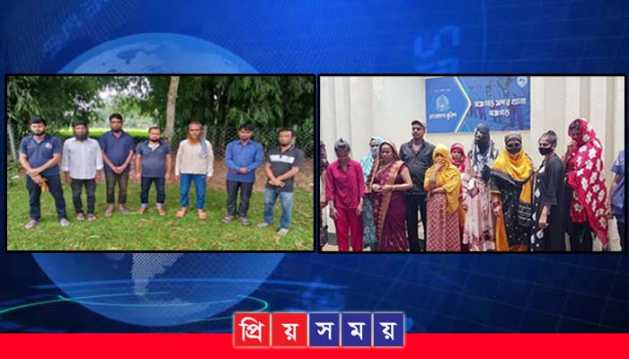 আটককৃতরা হলেন যশোর জেলা ঝিকরগাছা উপজেলার জয়দেবপুর উত্তর দেওলি গ্রামের শের আলীর ছেলে ইয়াসিন আলী (৩৫), নিসন্দপুর ঘাসখালি এলাকার অলিউর হোসেনের মেয়ে নুরবানু খাতুন (৩৫),নওগা জেলার আতরাই উপজেলার আহসানগঞ্জ খড়েরবাড়ি এলাকার আবু বক্করের মেয়ে জেমি খাতুন (২৩),নরসিংদি জেলার মাধবদি উপজেলার বড়চাপা পাইকান এলাকার বাচ্চু মিঞার মেয়ে শিখা আক্তার (৩৬), সিলেট জেলার কানাইঘাট উপজেলার শিবনগর গ্রামের তসিমুল হকের মেয়ে জেরিন বেগম(২৩),যশোর জেলার বেনাপোল উপজেলার উত্তর কাগজপুকুর গ্রামের আমির সরদারের মেয়ে শাহাররুন খাতুন (৪০),বরিশাল জেলার হারতা উপজেলার দক্ষিণ হারতা গ্রামের মিজানুর রহমানের মেয়ে হাফসা আক্তার (২০), কক্সবাজার জেলার বন্দরপাড়া গ্রামের নুরুল ইসলামের মেয়ে রোমানা আক্তার (২০), গোপালগঞ্জ জেলার কোটালি পাড়া উপজেলার কোনাবাড়ি এলাকার নওয়াব আলী শেখের মেয়ে ময়না খাতুন (২২), খাগড়াছড়ি জেলার দিঘীনালা উপজেলার কাবথোলি উত্তর হাচিনপুর এলাকার আলী নেওয়াজের মেয়ে আছিয়া আক্তার (২৩)।