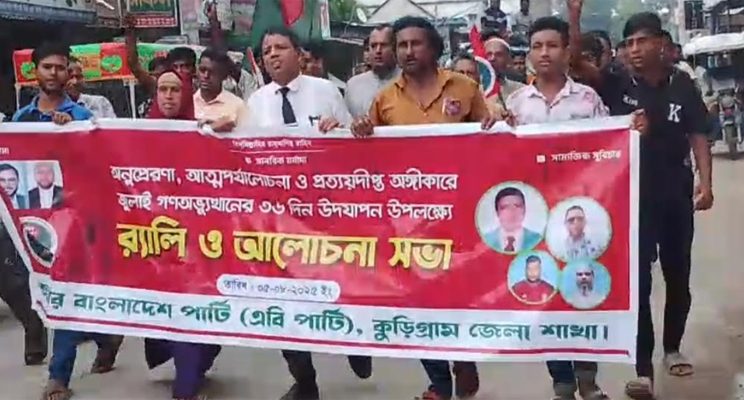 কুড়িগ্রামে জুলাই বর্ষপূর্তিতে গণঅভ্যুত্থানে নিহত শহীদদের স্মরণে এবি পার্টির র ্যালী ও আলোচনা অনুষ্ঠিত হয়েছে। অনুপ্রেরণা, আত্মপর্যালোচনা, প্রত্যয়দীপ্ত অঙ্গীকারে জুলাই গণঅভ্যুত্থানের ৩৬ দিন উপলক্ষে এসব কর্মসূচি পালন করা হয়।