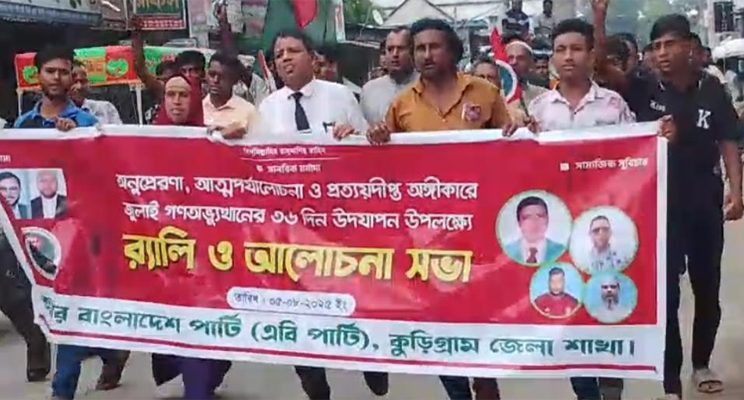 কুড়িগ্রামে জুলাই বর্ষপূর্তিতে গণঅভ্যুত্থানে নিহত শহীদদের স্মরণে এবি পার্টির র ্যালী ও আলোচনা সভা অনুষ্ঠিত হয়েছে। অনুপ্রেরণা, আত্মপর্যালোচনা, প্রত্যয়দীপ্ত অঙ্গীকারে জুলাই গণঅভ্যুত্থানের ৩৬ দিন উপলক্ষে এসব কর্মসূচি পালন করা হয়।