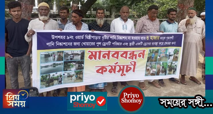 মানববন্ধনে বক্তারা দ্রুত পানি নিস্কাশনের স্থায়ী সমাধান, ড্রেন সংস্কার ও নিয়মিত রক্ষণাবেক্ষণের দাবি জানান। তারা জেলা প্রশাসক মোঃ রফিকুল ইসলাম ও পৌর প্রশাসক মোঃ রিয়াজ উদ্দিনের জরুরি হস্তক্ষেপ কামনা করেন।