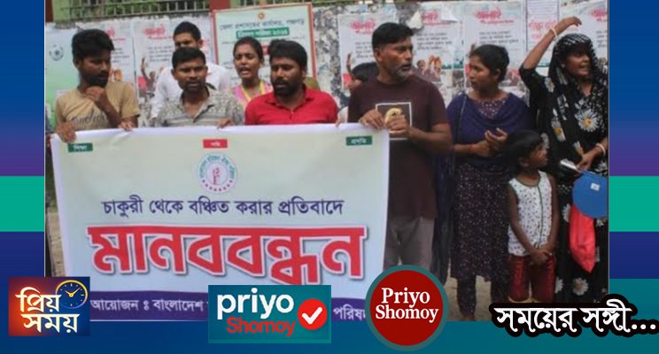 পঞ্চগড়ে পরিচ্ছন্নতা কর্মী পদে হরিজন সম্প্রদায়ের লোককে নিয়োগ না দিয়ে হিন্দু ও মুসলমানকে নিয়োগ দেওয়ার প্রতিবাদে মানববন্ধন ও বিক্ষোভ করেছে হরিজন বাসফোর ঐক্য পরিষদ। মঙ্গলবার (১২ আগষ্ট) জেলা প্রশাসকের কার্যালয়ের সামনে এ মানববন্ধন হয়। এর আগে জেলা জর্জ কোর্টের সামনে থেকে বিক্ষোভ নিয়ে সেখানে অবস্থান নেয় তারা।