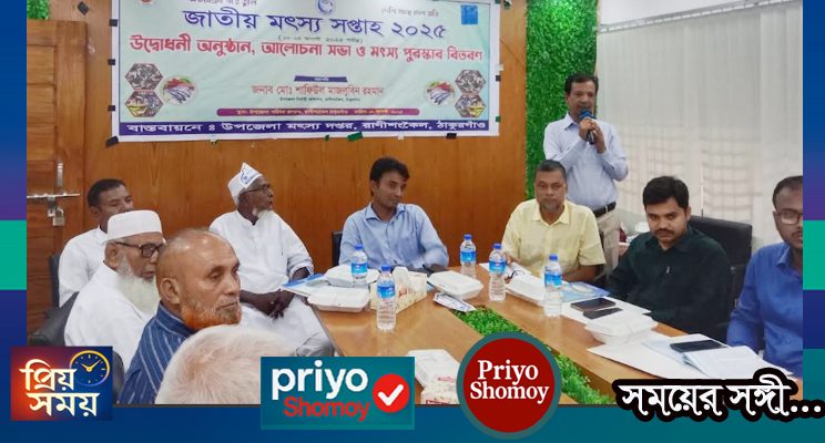 ঠাকুরগাঁওয়ের রাণীশংকৈল উপজেলায় জাতীয় মৎস্য সপ্তাহ-২০২৫ পালিত হয়েছে। এ উপলক্ষে সোমবার (১৮ আগষ্ট) উপজেলা পরিষদ পুকুরে বিভিন্ন প্রজাতির মাছের পোনা অবমুক্ত করা হয়। পরে উপজেলা হলরুমে ইউএনও শাফিউল মাজলুবিন রহমানের সভাপতিত্বে এক আলোচনা সভা ও পুরস্কার বিতরণ অনুষ্ঠিত হয়।