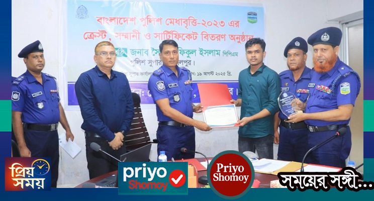 আজ মঙ্গলবার (১৯ আগস্ট) সকালে পুলিশ সুপারের কার্যালয়ের সম্মেলন কক্ষে বাংলাদেশ পুলিশের মেধাবৃত্তি-২০২৩ এর ক্রেস্ট, সম্মানী ও সার্টিফিকেট বিতরণ অনুষ্ঠিত হয়।