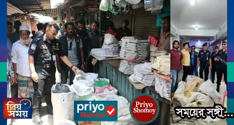 রাজশাহীর শহরের বিভিন্ন জায়গাতে ভ্রাম্যমাণ আদালত ও র্যাব ৫ অভিযান চালিয়ে , বিভিন্ন ধরনের নিষিদ্ধ পলিথিন ব্যাগ , পলিথিন তৈরির কাঁচামাল জব্দ করেন।