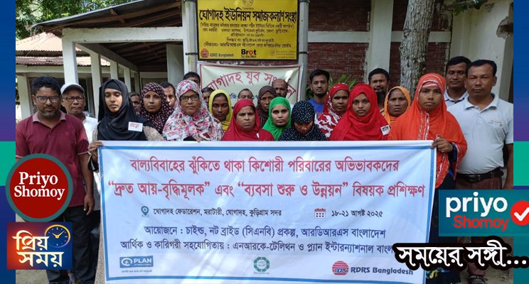 বাল্য বিয়ের ঝুঁকিতে থাকা কিশোরী পরিবারের অভিভাবকদের ‘দ্রুত আয় বৃদ্ধিমুলক’ এবং ‘ব্যবসা শুরু ও উন্নয়ন’ বিষয়ক প্রশিক্ষণ অনুষ্ঠিত হয়েছে।