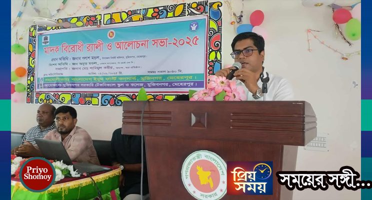 মুজিবনগর মাদকবিরোধী সামাজিক সচেতনতা সৃষ্টির লক্ষ্যে এক বর্ণাঢ্য র্যালী ও আলোচনা সভা অনুষ্ঠিত হয়েছে। বৃহস্প্রতিবার (২৫শে সেপ্টেম্বর ২০২৫) সকাল ৯:৩০ মিনিটে মুজিবনগর টেকনিক্যাল স্কুল এন্ড কলেজ এর উদ্যোগে বাংলাদেশ ইয়ুথ ফার্স্ট কনসার্ন (BYFC) এর সহযোগিতায় কর্মসূচির আয়োজন করা হয়।