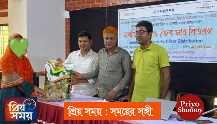 মেরিডিয়ান ইনস্টিটিউটের সহায়তায় বাস্তবায়িত সুন্দরবনে মৎস্যজীবীদের জন্য টেকসই মৎস্য সম্পদ এবং জলবায়ু পরিবর্তন অভিযোজনের লক্ষ্যে ব্লু কার্বন প্রতিবেশ সুরক্ষা প্রকল্প এর আওতায় প্রান্তিক নারীদের মাঝে বিনামূল্যে শিম, গাজর, টমেটো, লাল শাক, পালং শাক ও আলু বীজসহ জৈব সার বিতরণ করা হয়।