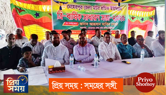 মেহেরপুর জেলা মোটর শ্রমিক ইউনিয়নের ত্রিবার্ষিক সাধারণ সভা অনুষ্ঠিত হয়েছে। বুধবার (২২ অক্টোবর) সকালে মেহেরপুর পশু হাটস্থ ইউনিয়নের প্রধান কার্যালয়ে এ সভা অনুষ্ঠিত হয়।