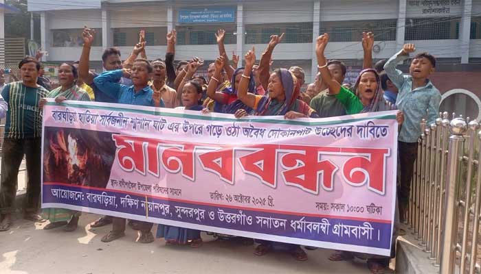 আজ রবিবার (২৬ অক্টোবর) সকালে রাণীশংকৈল উপজেলা পরিষদ চত্বরে এ মানববন্ধন ও বিক্ষোভ সমাবেশ আয়োজন করেন বারঘড়িয়া, দক্ষিণ নায়ানপুর, সুন্দরপুর ও উত্তরগাঁও এলাকার সনাতন ধর্মাবলম্বী গ্রামবাসীরা।