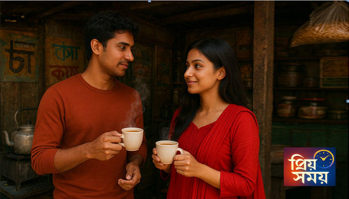 সাদা শাড়ি। চুলে খোঁপা। চোখে একই শান্তি। কিন্তু আজ তার ঠোঁটে একটা হালকা হাসি। সে বসলো। আমি চুপ। সে চুপ। চায়ের কাপ এলো। দুটো। গরম। ভাপ উঠছে।