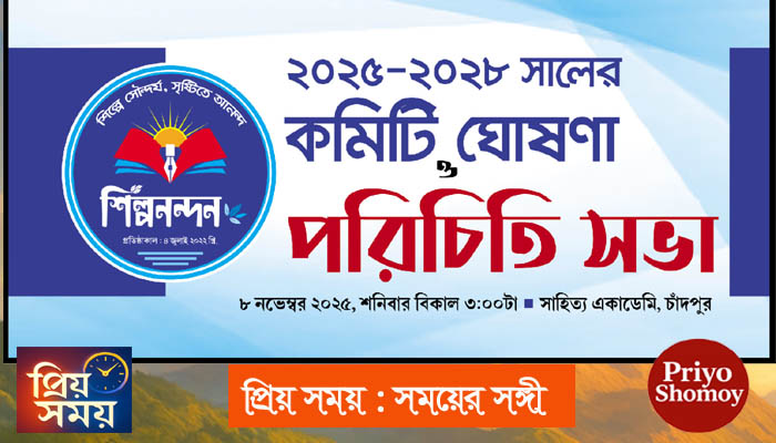 চাঁদপুরের সাহিত্য-সংস্কৃতি অঙ্গনে নতুন মাত্রা যোগ করতে আগামীকাল অনুষ্ঠিত হতে যাচ্ছে শিল্প-সাহিত্যের সংগঠন ‘শিল্পনন্দন’-এর কমিটি ঘোষণা ও পরিচিতি সভা। ‘শিল্পে সৌন্দর্য, সৃষ্টিতে আনন্দ’ এই স্লোগানে ৮ নভেম্বর বিকাল ৩টায় চাঁদপুর সাহিত্য একাডেমি মিলনায়তনে আয়োজিত এই সভায় উপস্থিত থাকবেন জেলার বিশিষ্ট কবি, লেখক, শিল্পী, গবেষক ও সাহিত্যপ্রেমীরা।
