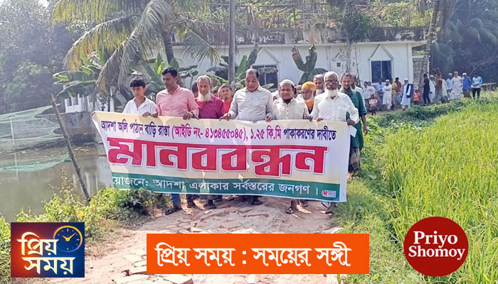 ২৪ সালের ভয়াবহ জলাবদ্ধতার কারণে পুরো সড়কটি তিনমাস পানিবন্দি অবস্থায় ছিলো। ফলে স্কুলগামী শিক্ষার্থী, অসুস্থ লোকজনকে নিয়ে চরম বিপাকে পড়তে হয়েছে এই এলাকায় হাজার হাজার লোকজনকে। শুষ্ক মৌসুমেও যানবাহন গুলো এই সড়কটি দিয়ে চলাচল করতে চায় না, শুধু সড়কের বেহাল দশার কারণে। বর্ষা মৌসুমেতো চলাচলের অযোগ্য হয়ে পড়ে সড়কটি। ফলে বাধ্য হয়ে সড়কটি সংস্কার করে তথা পাকাকরণের দাবিতে মানববন্ধন করেছে বিক্ষুব্ধ এলাকাবাসী। মঙ্গলবার (১১ নভেম্বর ২০২৫) চাঁদপুরের ফরিদগঞ্জ উপজেলার গুপ্টি পশ্চিম ইউনিয়নের আদশা গ্রামে এই মানববন্ধন অনুষ্ঠিত হয়।