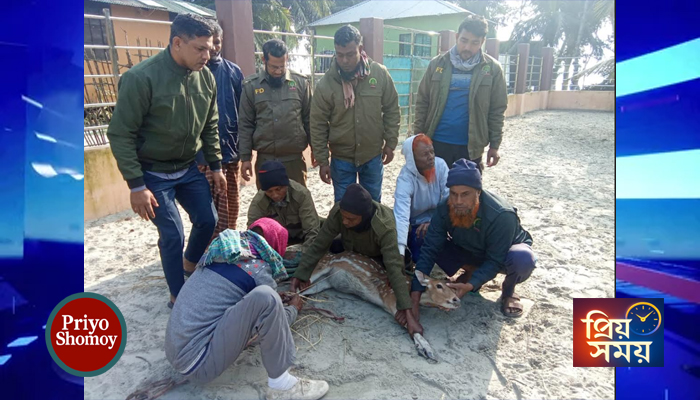 বনবিভাগ সুত্রে প্রকাশ বুধবার(৩১ ডিসেম্বর) সকাল ৭টার দিকে সুন্দরবন থেকে খোলপেটুয়া নদী পার হয়ে শ্যামনগর উপজেলার সুন্দরবন সংলগ্ন দ্বীপ ইউনিয়ন গাবুরার ডুমুরিয়া গ্রামে চলে আসে। স্থানীয়রা দেখতে পেয়ে বনবিভাগকে সংবাদ দিলে পরবর্তীতে হরিণটি কৌশলে উদ্ধার করে বনবিভাগ সুন্দরবনের কলাগাছিয়ায় অবমুক্ত করেন।