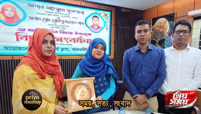 পদোন্নতির আনন্দ আর বিদায়ের আবেগঘন মুহূর্ত দুটি অনুভূতির মেলবন্ধনে বর্ণিল আয়োজনে বিদায় জানানো হলো বগুড়ার আদমদীঘি উপজেলা সহকারী কমিশনার (ভূমি) মাহমুদা সুলতানাকে।