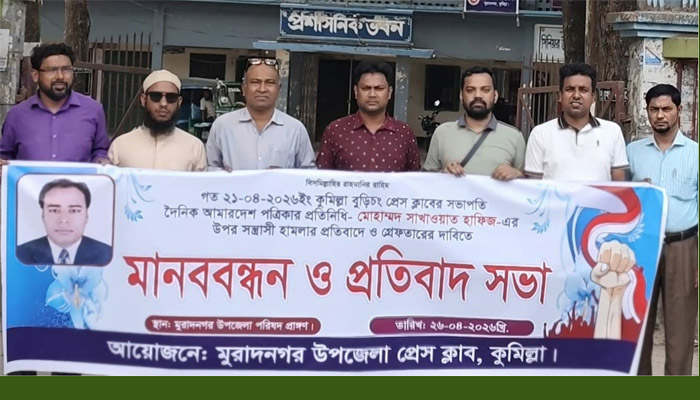 উল্লেখ্য, আহত সাংবাদিক সাখাওয়াত হাফিজ বর্তমানে চিকিৎসাধীন রয়েছেন। মুরাদনগরের এই মানববন্ধন থেকে তাঁর দ্রুত সুস্থতা কামনা করার পাশাপাশি সাংবাদিক সুরক্ষায় কঠোর আইন প্রণয়নের দাবি জানানো হয়।